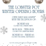 The Lobster Pot Winter Opening Hours. Open Daily 09:30-4:30pm with the exception of Monday 8/12, Monday 22-Thursday 25, Monday 5/1-Friday 9/1.